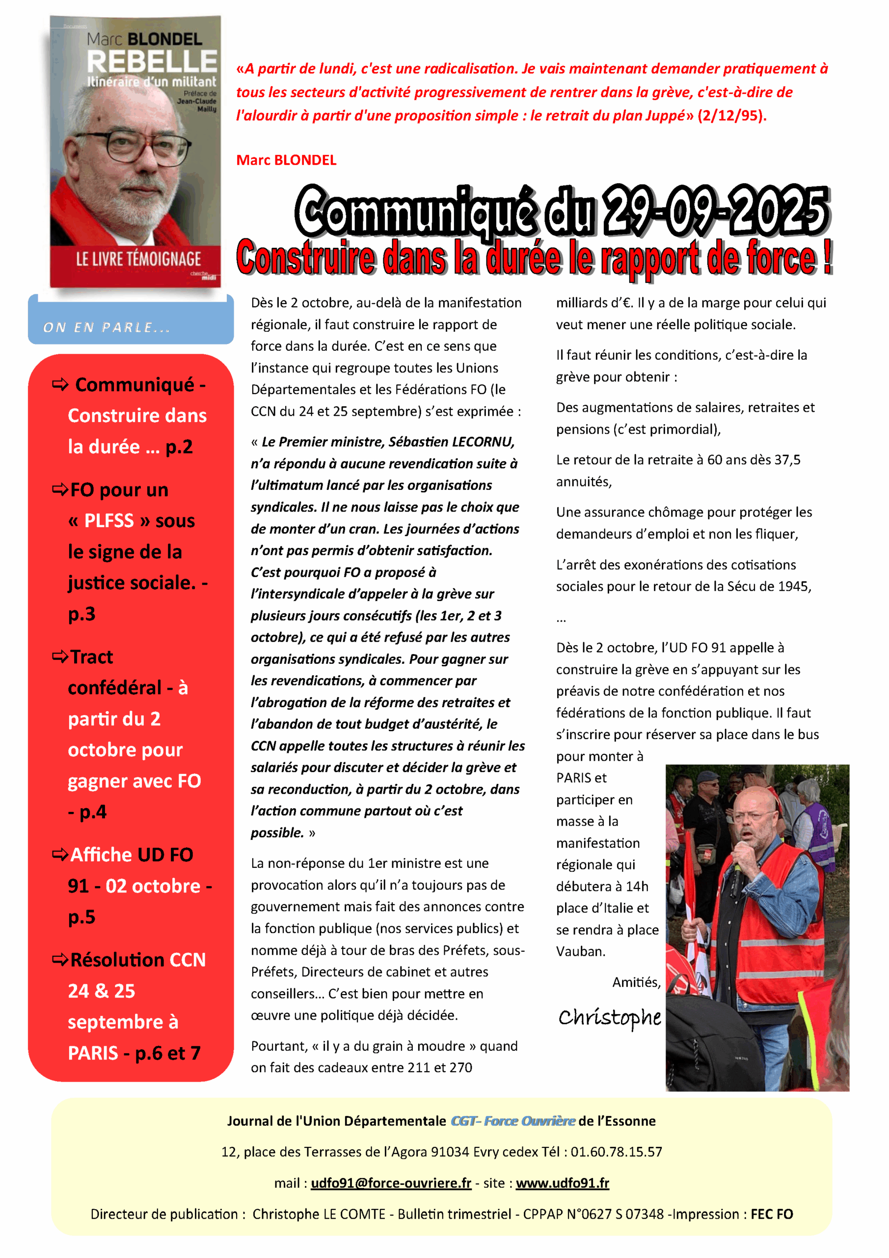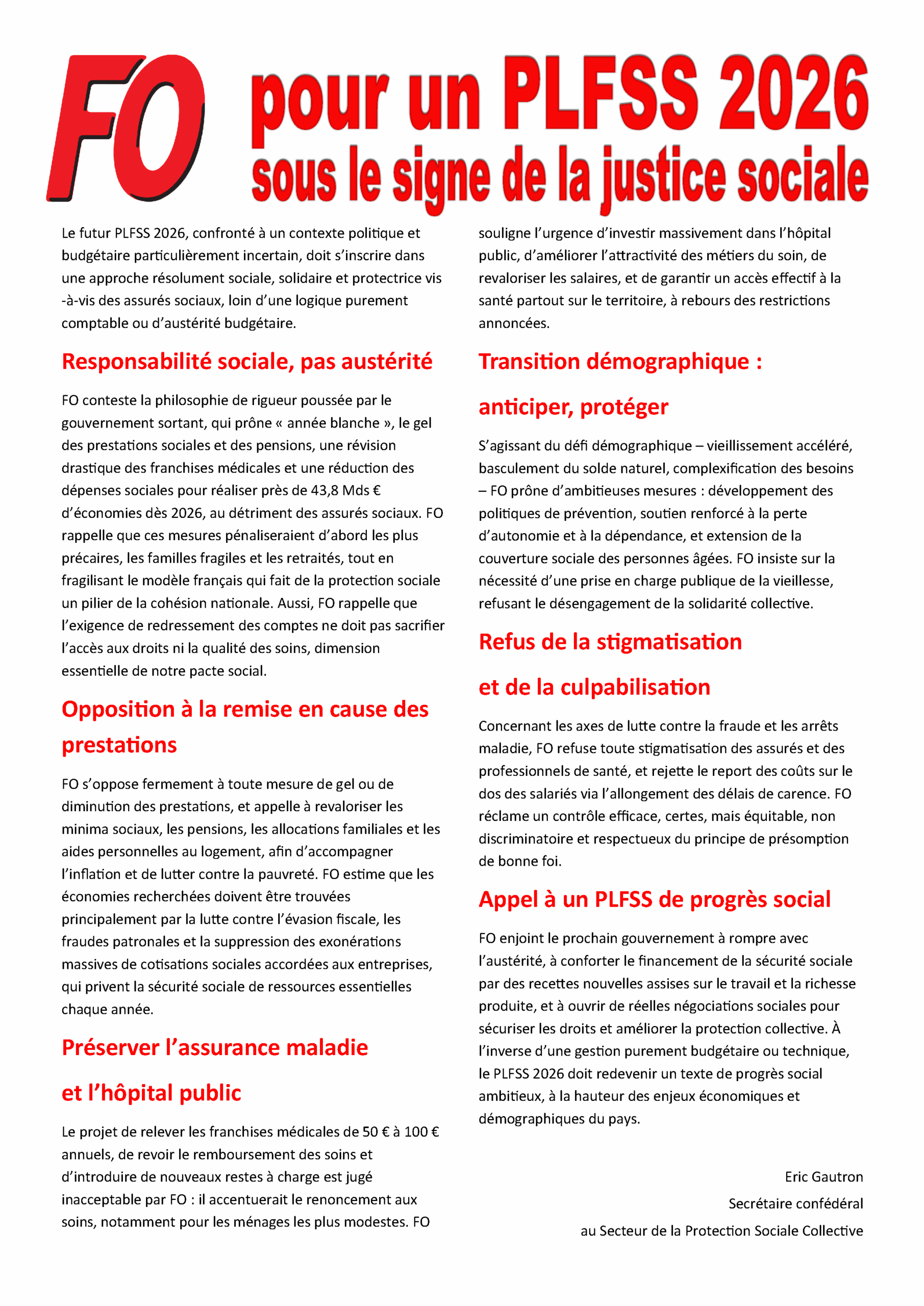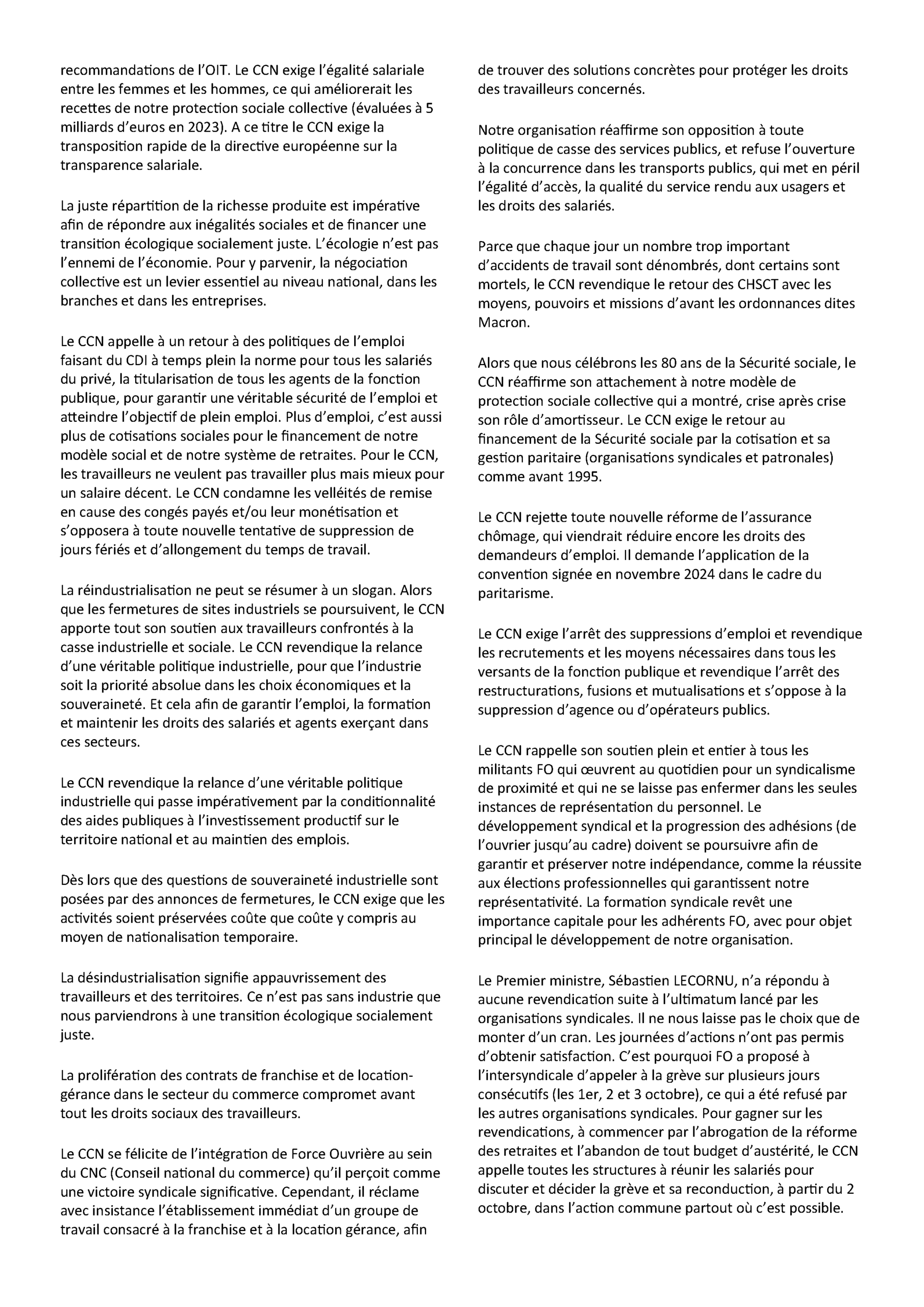 « Le Premier ministre, Sébastien LECORNU, n’a répondu à aucune revendication suite à l’ultimatum lancé par les organisations syndicales. Il ne nous laisse pas le choix que de monter d’un cran. Les journées d’actions n’ont pas permis d’obtenir satisfaction. C’est pourquoi FO a proposé à l’intersyndicale d’appeler à la grève sur plusieurs jours consécutifs (les 1er, 2 et 3 octobre), ce qui a été refusé par les autres organisations syndicales. Pour gagner sur les revendications, à commencer par l’abrogation de la réforme des retraites et l’abandon de tout budget d’austérité, le CCN appelle toutes les structures à réunir les salariés pour discuter et décider la grève et sa reconduction, à partir du 2 octobre, dans l’action commune partout où c’est possible. »