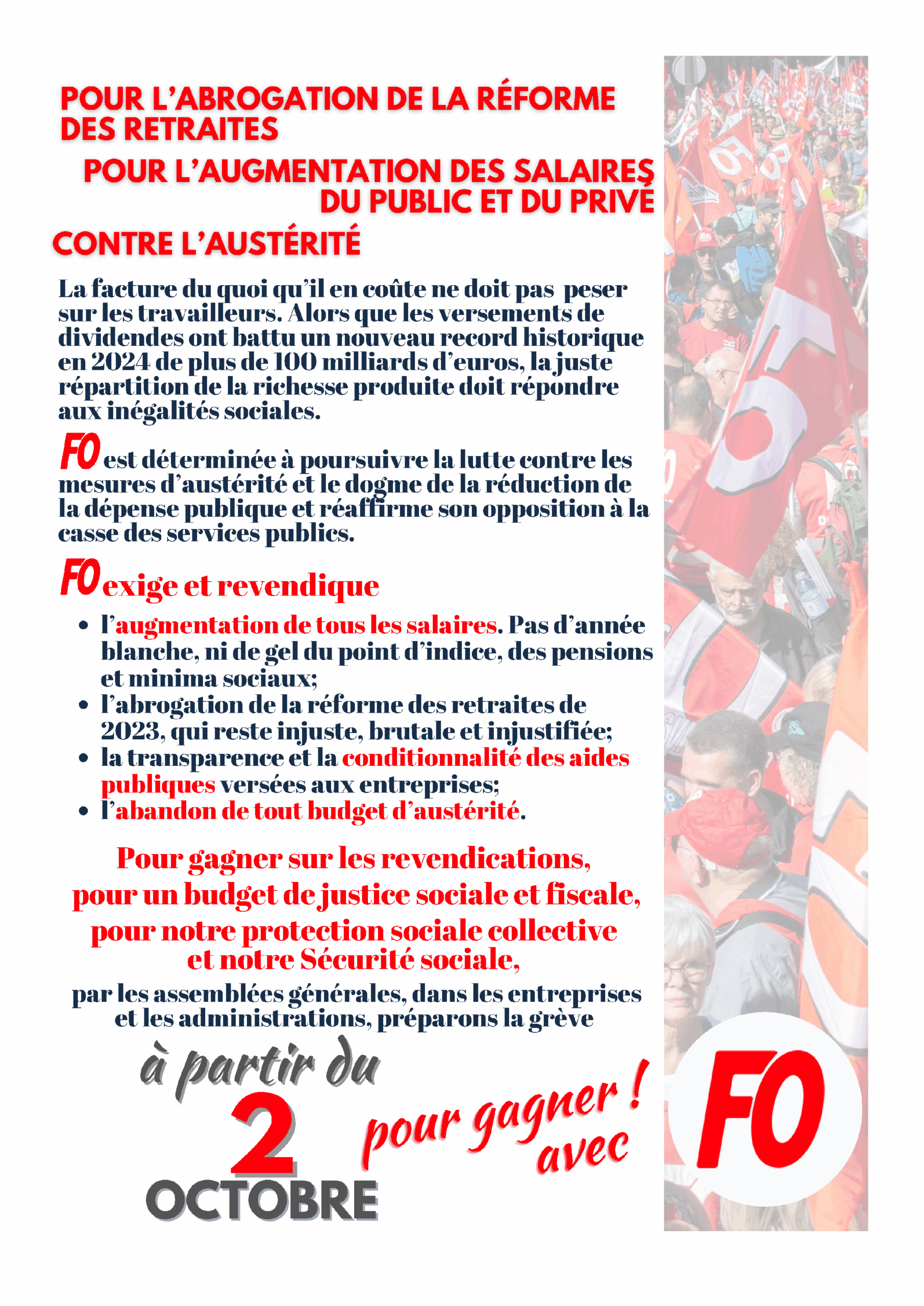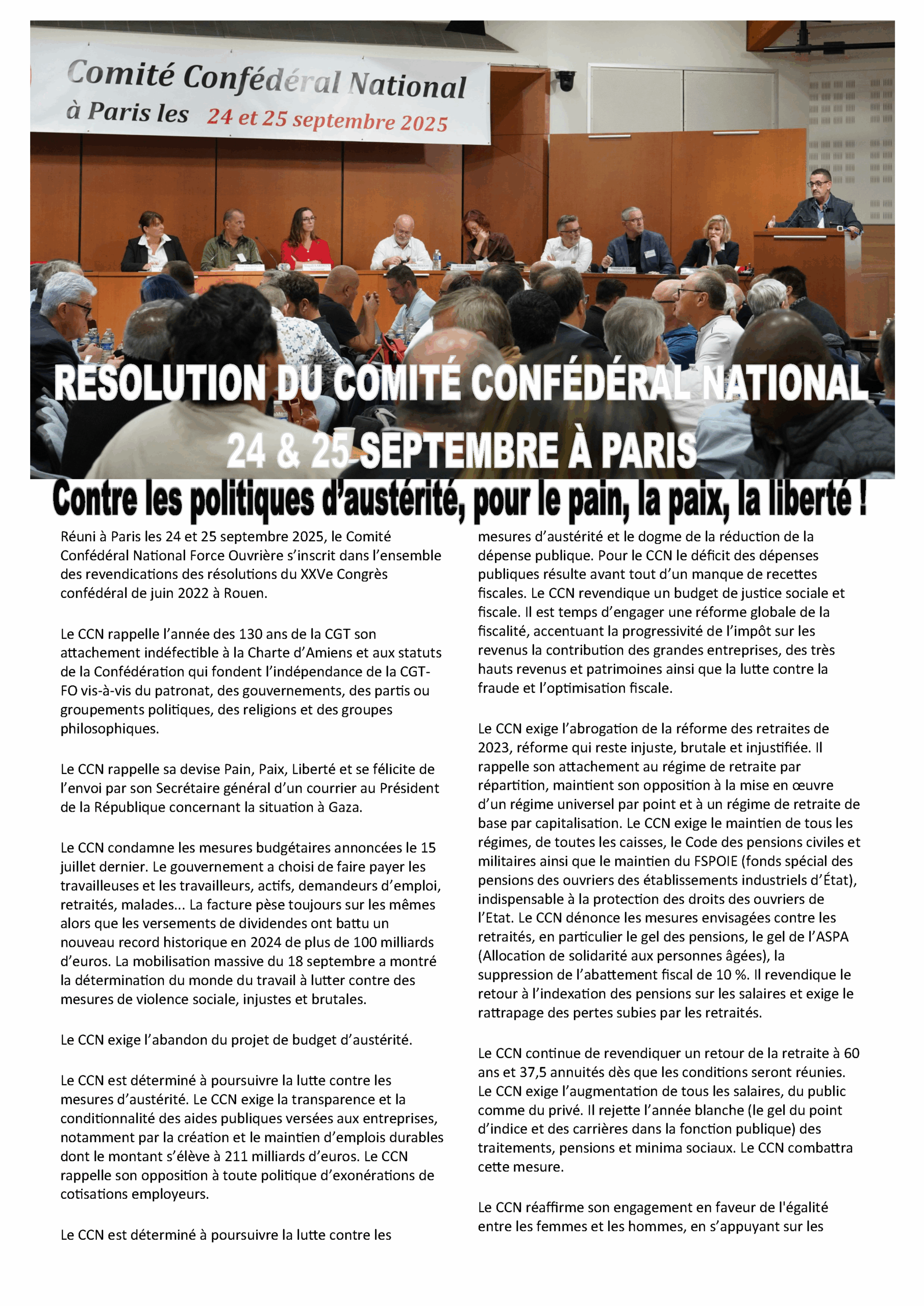 Dès le 2 octobre, au-delà de la manifestation régionale, il faut construire le rapport de force dans la durée. C’est en ce sens que l’instance qui regroupe toutes les Unions Départementales et les Fédérations FO (le CCN du 24 et 25 septembre) s’est exprimée :