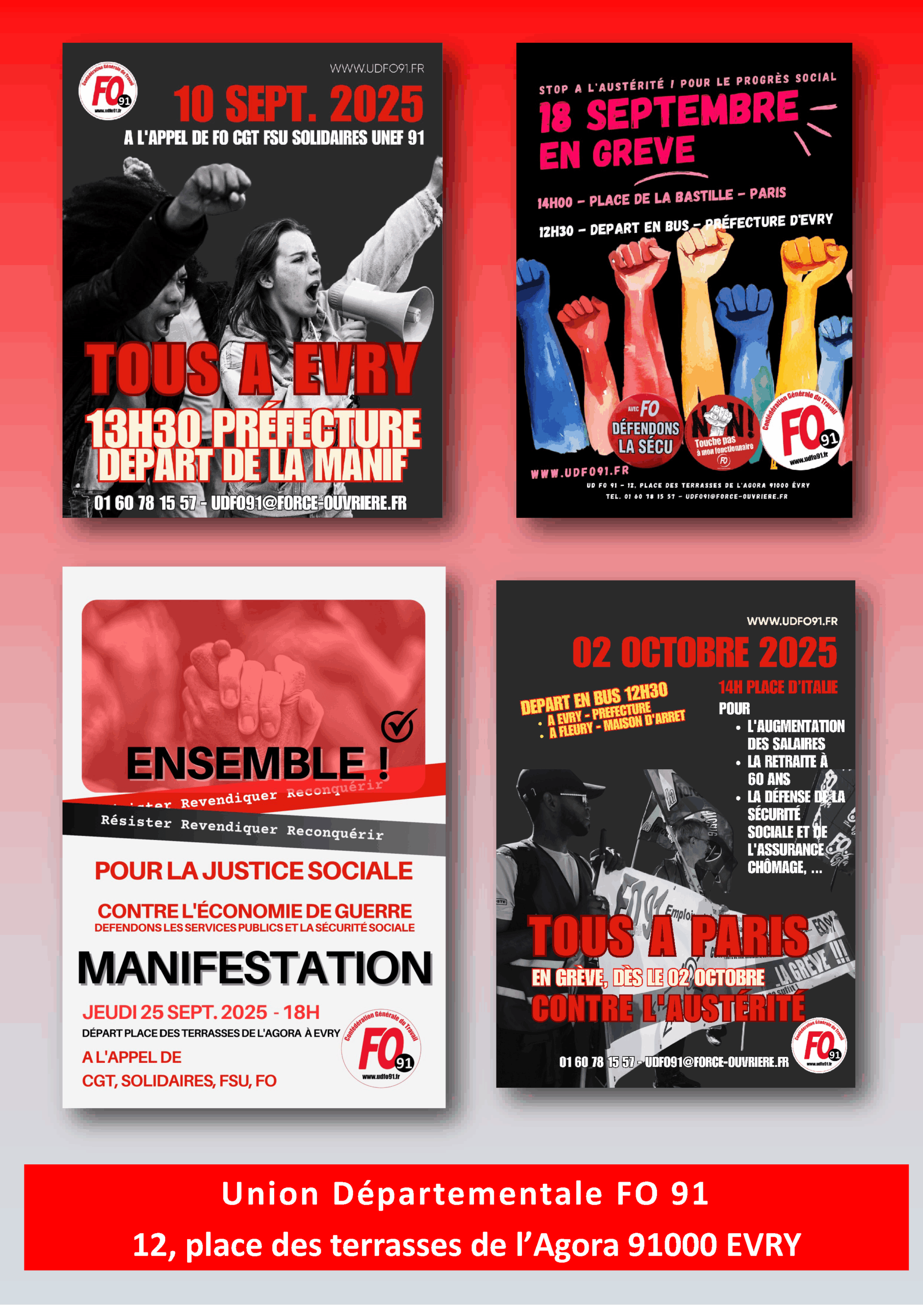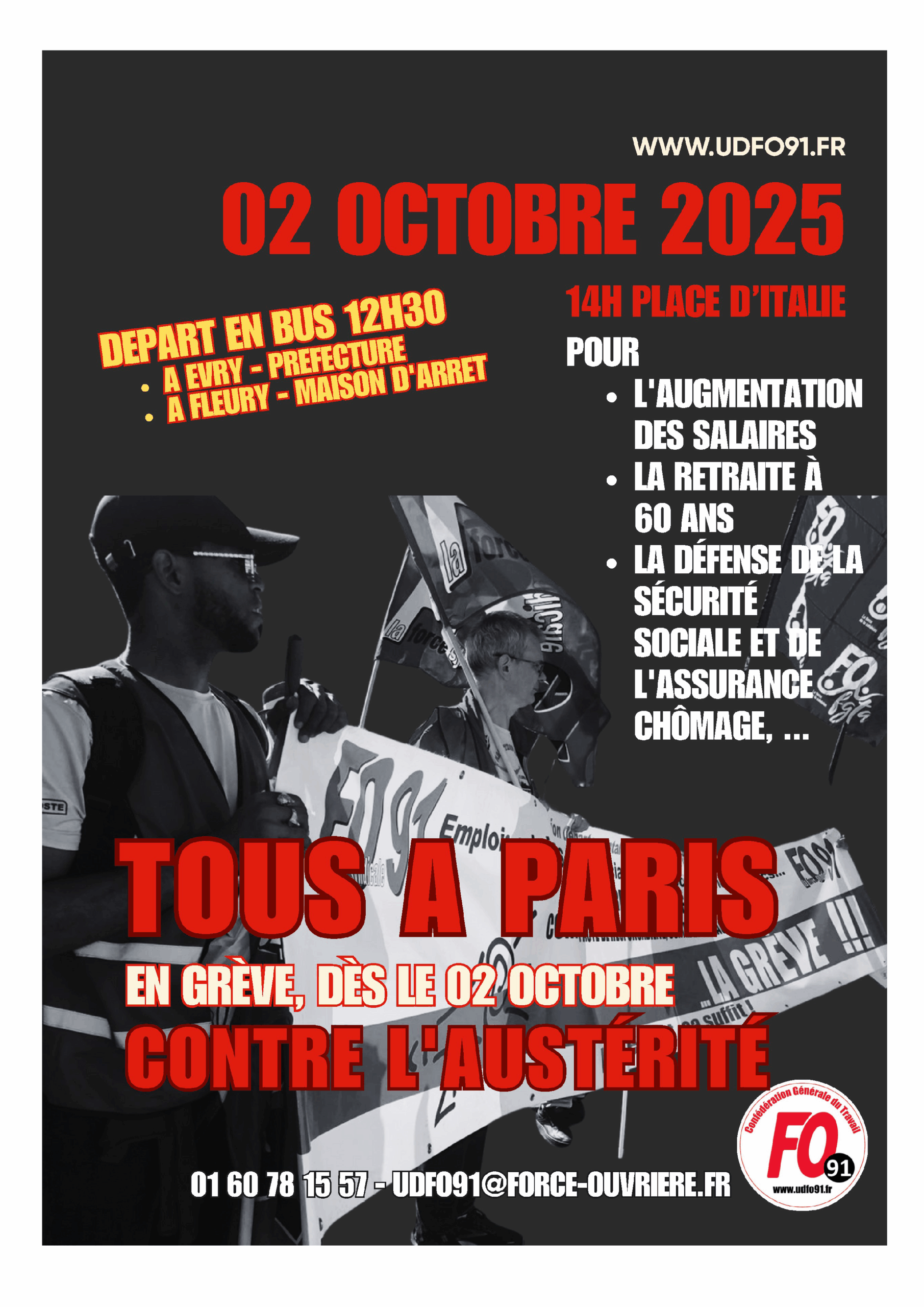 Dès le 2 octobre, l’UD FO 91 appelle à construire la grève en s’appuyant sur les préavis de notre confédération et nos fédérations de la fonction publique. Il faut s’inscrire pour réserver sa place dans le car pour monter à PARIS et participer en masse à la manifestation régionale qui débutera à 14h00 Place d’Italie et se rendra Place Vauban.